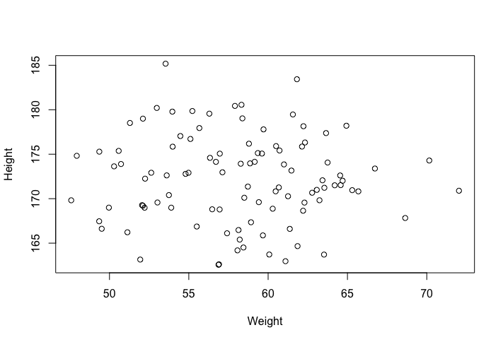 1 > plot(weight, height, xlab="Weight", ylab="Height")