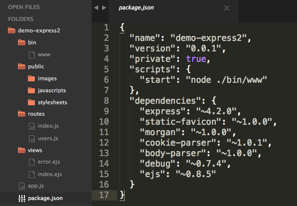 在這邊將自動的安裝相依套件 express, ejs ,接著我們打開 sublime 編輯器,看到 package.json ,你可以看到 dependencies 的物件裡面自動安裝了許多相依項目。