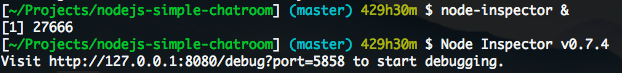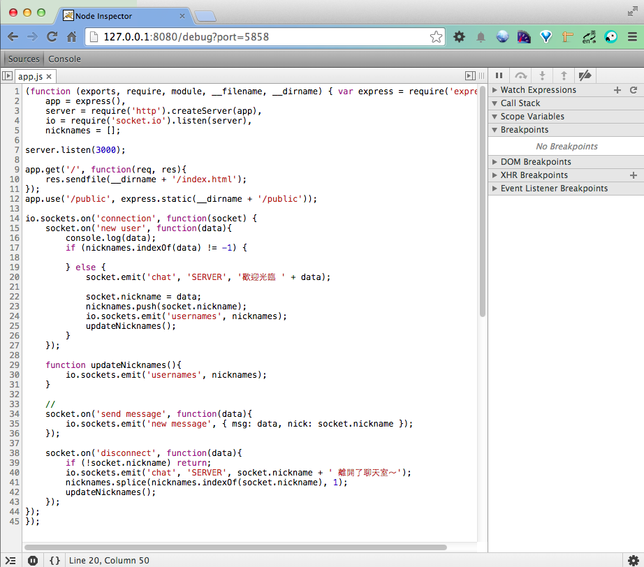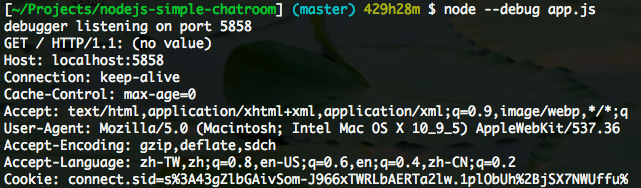 執行時會預設 5858 port 口。我們使用前一個聊天室專案來示範 ,使進行 debug 動作時請下指令: