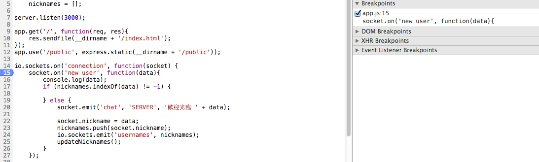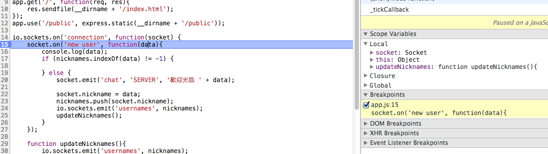 在這邊我下了一個 建立新的使用者的中斷點,也就是新的使用者進到聊天室裡面,可以看到調校的頁面就立刻監測到,如下所示:
