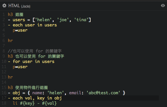 首先,我們先來比較一下 HTML 跟 Jade 的表示方式