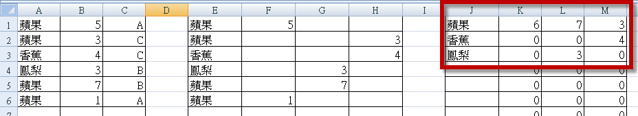 然後,統計數量區,就是計算各種不同分類的不重複水果數量有多少,以下就是各欄位輸入的函數