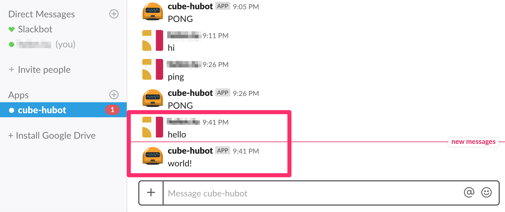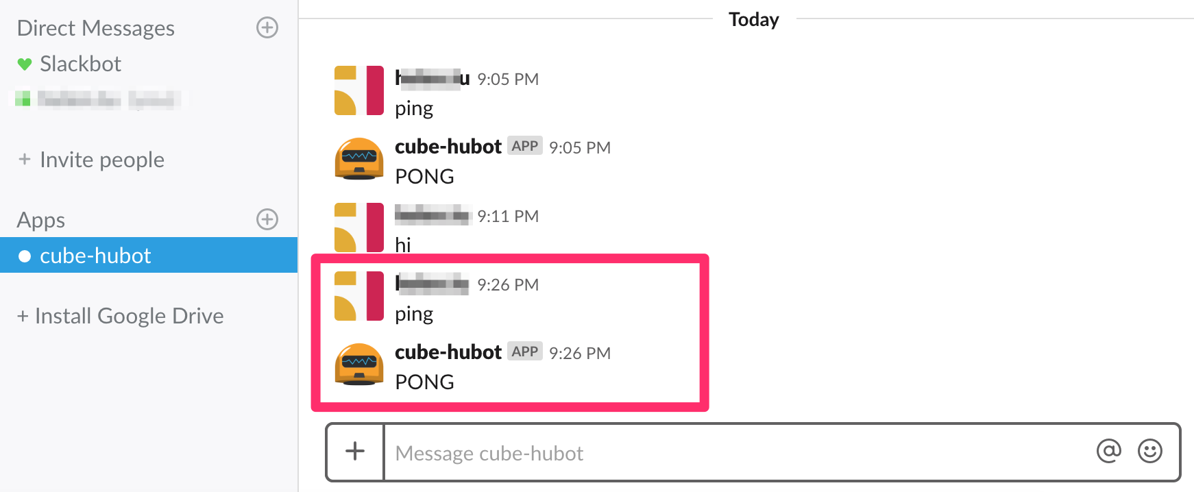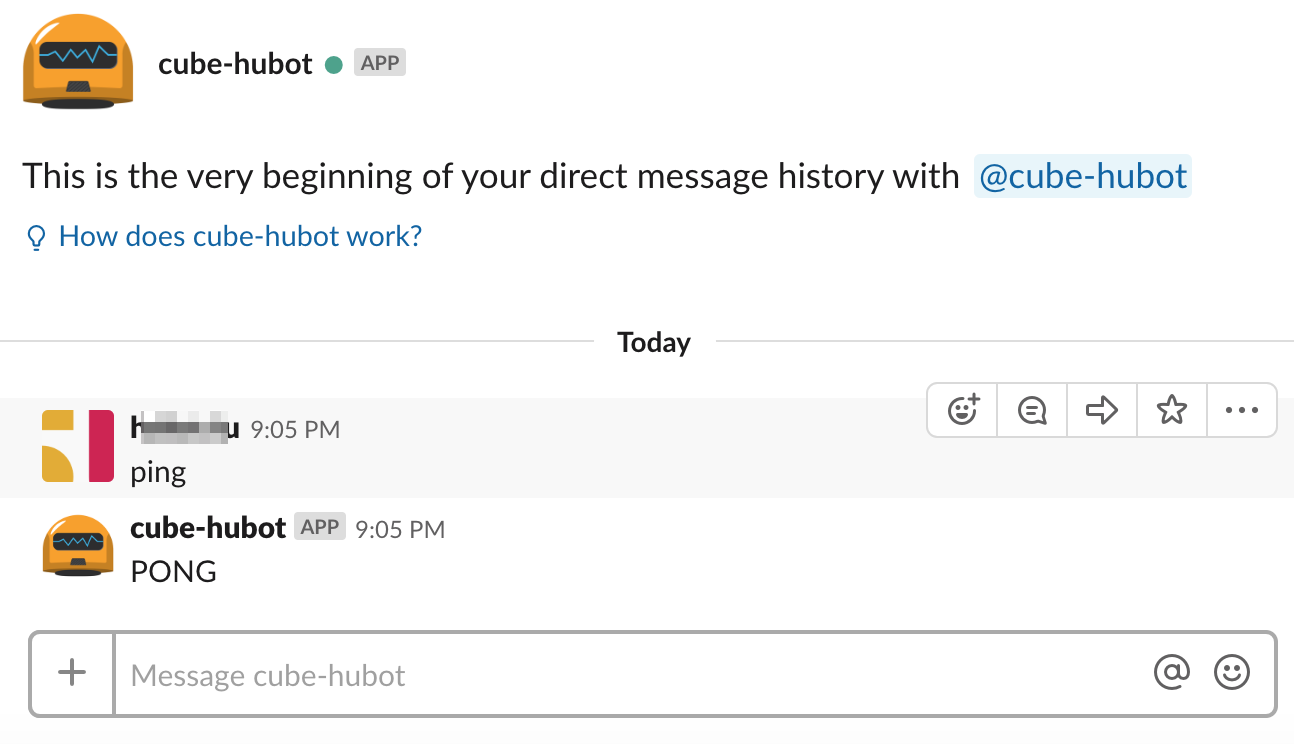 打開 slack 的 hubot 對話輸入 ping,這時候機器人回你 PONG 時就代表成功了。